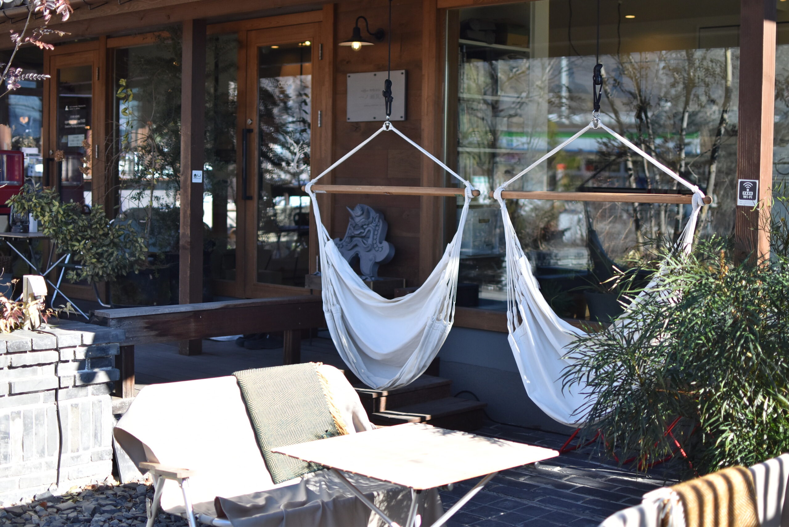 ハンモックチェアは梁から下げて使う〈座るタイプのハンモック〉です。ハタフェスでは、専用のスタンドと組み合わせて置かせていただきます。お店やまち巡りの途中に、ハンモックチェアでひと休みしていただけたらと思います。