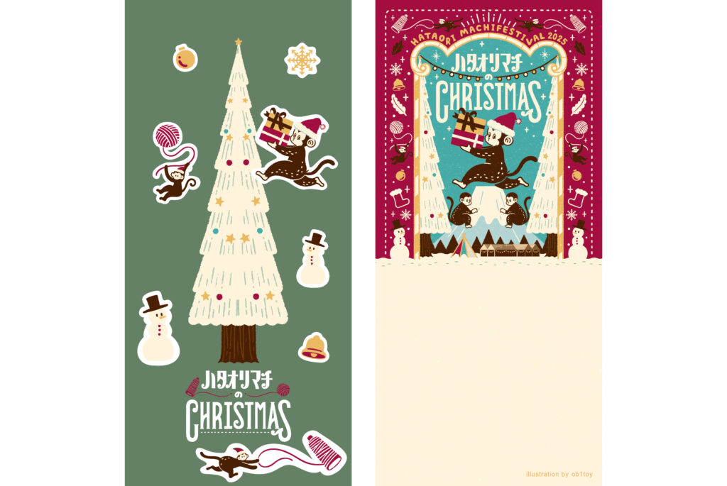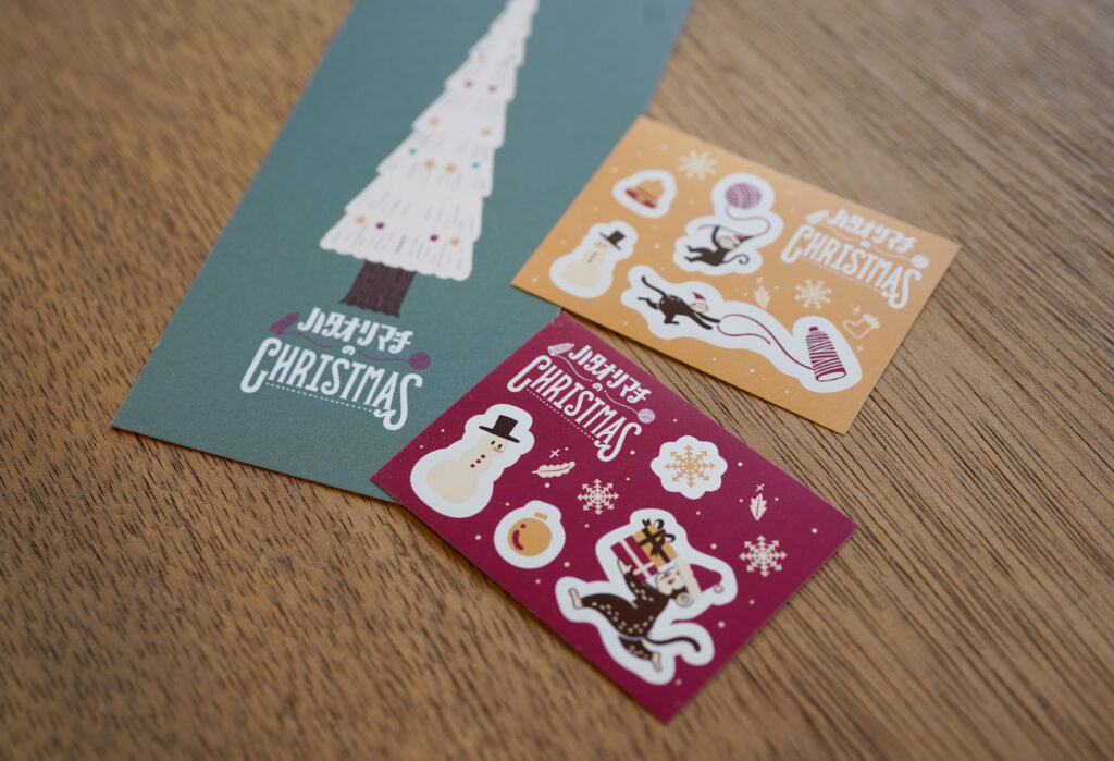 ハタオリマチのクリスマス2025では、シールラリーを実施します。台紙はクリスマスカードになっているので、集めたシールで自由にデコレーションをしたり、裏面にメッセージを書いたりして、自分だけのとっておきのクリスマスカードをつくることができます。