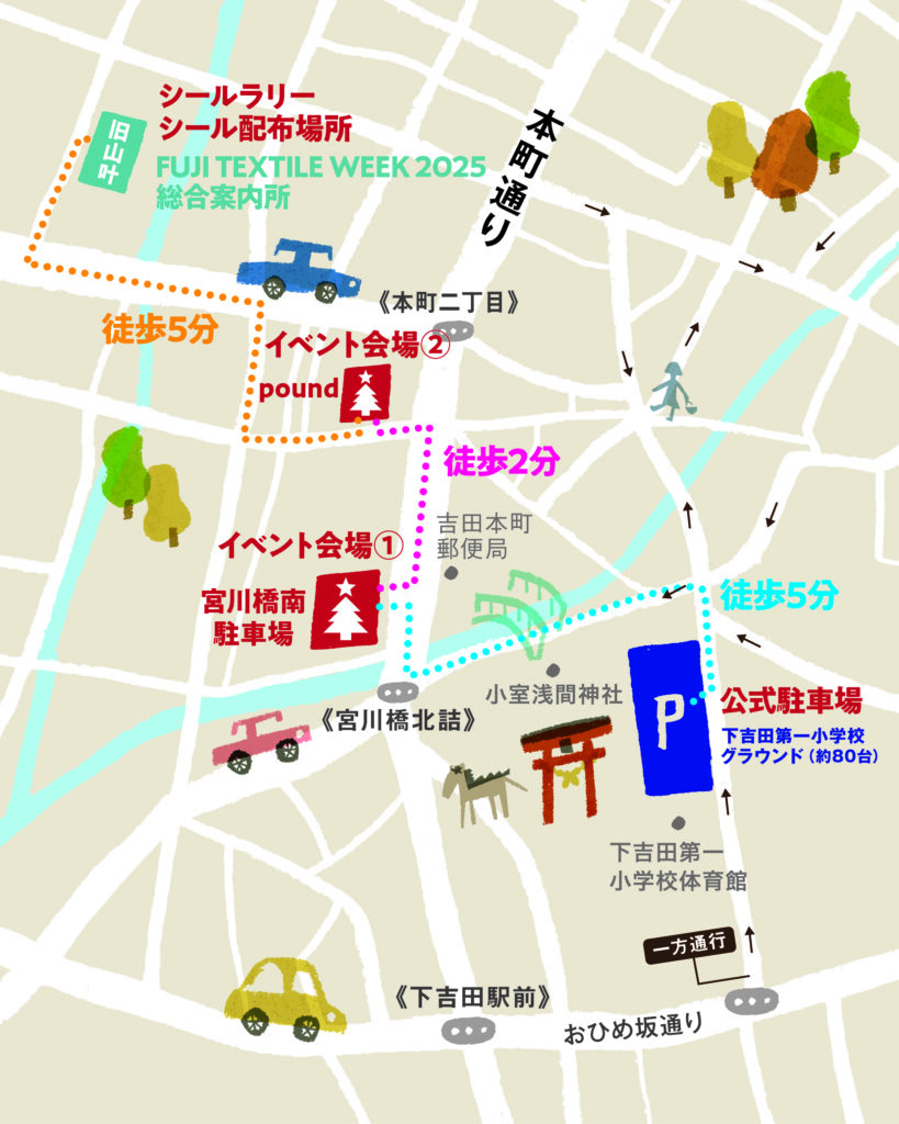 台紙はハタオリマチのクリスマスの会場①の宮川橋南駐車場、シールは会場②のpoundと FUJI TEXTILE WEEKの総合案内所である旧山叶の2ヶ所で配布します。